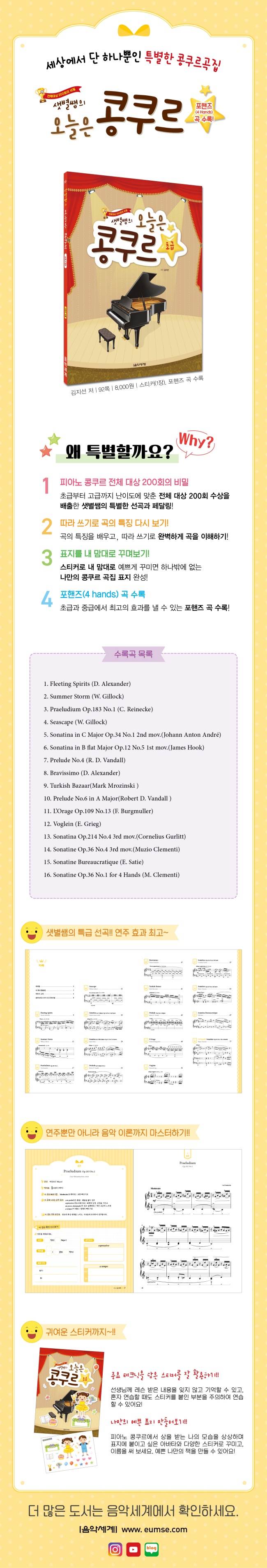 ‘ÇǾƳë ÄáÄí¸£ Àüü ´ë»ó 200ȸÀÇ ºñ¹Ð’ÀÇ ÀúÀÚ »ûº°½Ü ±èÁö¼± ¿øÀåÀÇ ÇǾƳë ÄáÄí¸£ °îÁýÀÔ´Ï´Ù. Áß±Þ, °í±Þ ÃÑ 3±ÇÀ¸·Î ÀûÀýÇÏ°Ô ³À̵µº°·Î ¹è¿ÇÏ¿´½À´Ï´Ù. ¿¬ÁÖ°îÁýÀ¸·Î¼ ¿¬ÁÖ¿¡¸¸ ÃÊÁ¡À» ¸ÂÃ߱⠺¸´Ù ³»°¡ ¿¬ÁÖÇÏ´Â ÀÌ °î¿¡ ´ëÇØ Á¤È®È÷ ¾Ë°í ¿¬ÁÖÇÒ ¼ö ÀÖµµ·Ï ÀÌ °îÀÇ Æ¯Â¡À» µû¶ó ¾µ ¼ö ÀÖµµ·Ï ±¸¼ºÇÏ¿´½À´Ï´Ù. ¶ÇÇÑ ³»Áö¿¡´Â Áß¿ä Å×Å©´ÐÀ» ´ãÀº ½ºÆ¼Ä¿¸¦ Ȱ¿ëÇÒ ¼ö ÀÖµµ·Ï ÇÏ¿© ¼±»ý´Ô²² ·¹½¼ ¹ÞÀº ³»¿ëÀ» ÀØÁö ¾Ê°í ±â¾ïÇØ È¥ÀÚ ¿¬½ÀÇÒ ¶§µµ ÁÖÀÇÇÏ¿© ¿¬½ÀÇÒ ¼ö ÀÖ½À´Ï´Ù. ÇǾƳë ÄáÄí¸£¿¡¼ »óÀ» ¹Þ´Â ³ªÀÇ ¸ð½ÀÀ» »ó»óÇÏ¸ç ³ª¸¸ÀÇ Ç¥Áö¸¦ ¿¹»Ú°Ô ²Ù¹Ð ¼ö ÀÖ°Ô ³»°¡ ºÙÀÌ°í ½ÍÀº ¾Æ¹ÙŸ¿Í ´Ù¾çÇÑ ½ºÆ¼Ä¿·Î ²Ù¹Ì°í À̸§À» ¾µ ¼ö ÀÖ¾î ¾ÆÀ̵éÀÇ Èï¹Ì¸¦ À¯¹ßÇÏ¿´½À´Ï´Ù. Æ÷ÇÚÁî °îÀ» ¼ö·ÏÇÏ¿© ¾Ó»óºíÀÇ Áñ°Å¿òµµ ´À³¥ ¼ö ÀÖ½À´Ï´Ù.