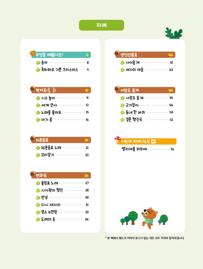 ÇǾƳ븦 óÀ½ ½ÃÀÛÇÏ´Â 6¼¼ ÀÌ»óÀÇ ÇнÀÀÚ¸¦ À§ÇÑ ±âÃÊ ÇÇ¾Æ³ë ±³º»ÀÔ´Ï´Ù. ±âÃÊ¿¡ Ãæ½ÇÇÏÁö¸¸ ´õ¿í ¿Ï¸¸ÇÑ Ä¿¸®Å§·³°ú Áøµµ¸¦ À§ÇØ ÃÑ 6±ÇÀ¸·Î ±¸¼ºÇÏ¿´½À´Ï´Ù. ÇÇ¾Æ³ë ¿¬ÁÖ »Ó¸¸ ¾Æ´Ï¶ó À̷аú ½ºÆ¼Ä¿ Ȱµ¿±îÁö ÇÑ ±ÇÀ¸·Î ³¡³¯ ¼ö ÀÖ´Â ¿ÃÀοø ±³Àç·Î, ÀÚÄ© Áö·çÇÒ ¼ö ÀÖ´Â ¹ÙÀÌ¿¤ °úÁ¤À» Èï¹Ì·Ó°Ô Á¢±ÙÇÒ ¼ö ÀÖµµ·Ï ÇÏ¿´½À´Ï´Ù. µ¿¿ä, Ŭ·¡½Ä, ±³°ú¼ ¼ö·Ï°î, ij·² µî ´Ù¾çÇÑ À帣ÀÇ ¼ö·Ï°îÀ» ½±°í Àç¹ÌÀÖ°Ô Æí°îÇÏ¿© Áö·çÇÏÁö ¾Ê°Ô ÇÏ¿´À¸¸ç, ¸Ç ¸¶Áö¸· Àå¿¡ °¢ ±ÇÀÇ º¹½À °³³äÀÇ ¿¬ÁÖ ÆäÀÌÁö¸¦ QR ÄÚµå ¹ÝÁÖ¿Í ÇÔ²² ¼ö·ÏÇØ µ¿¿µ»ó ÃÔ¿µ, ¹ßǥȸ µî ´Ù¾çÇÏ°Ô È°¿ëÇÒ ¼ö ÀÖ½À´Ï´Ù.