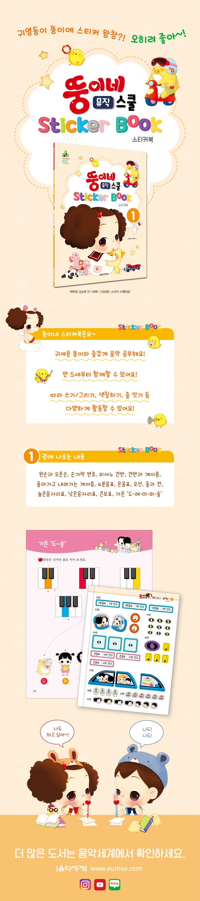 ¸¸ 5¼¼ºÎÅÍ Áñ°Ì°Ô À½¾ÇÀ» ÇнÀÇÒ ¼ö ÀÖ´Â ±³Àç·Î, ½ºÆ¼Ä¿¸¦ Áß½ÉÀ¸·Î µû¶ó ¾²±â, »öÄ¥Çϱâ, ÁÙÀÕ±â µî ´Ù¾çÇÑ È°µ¿À¸·Î ±¸¼ºµÇ¾î ÀÖ½À´Ï´Ù. ±Í¿©¿î ¶×ÀÌ Ä³¸¯ÅÍ¿Í ÇÔ²² Áñ°Ì°Ô ¹è¿ï ¼ö ÀÖµµ·Ï Ȱµ¿ ÆäÀÌÁö¸¦ ¼ö·ÏÇÏ¿´À¸¸ç, À½¾ÇÇпø »Ó¸¸ ¾Æ´Ï¶ó Áý¿¡¼ ¾ö¸¶¿Í ÇÔ²² ÇнÀÇÒ ¼ö ÀÖ½À´Ï´Ù.