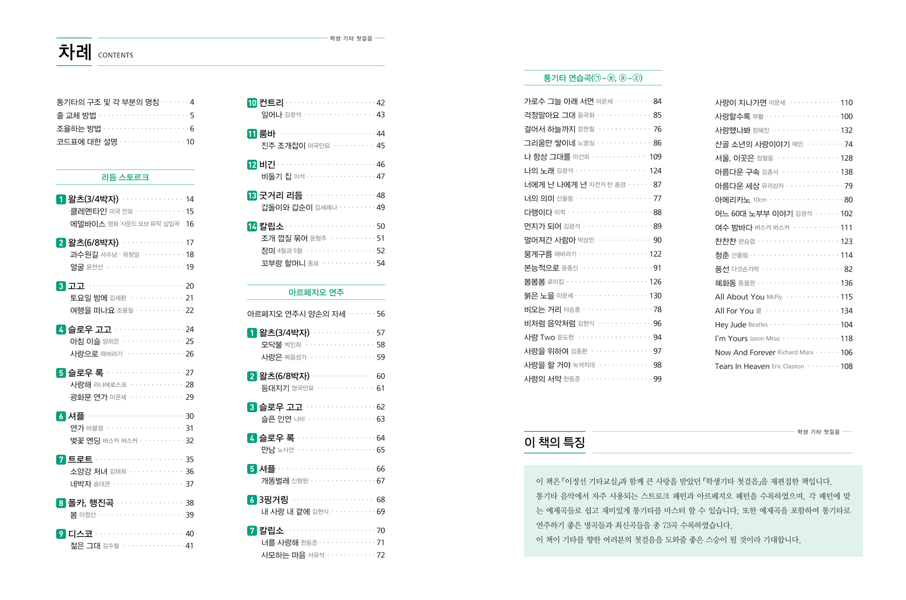 90³â´ëºÎÅÍ Å« Àα⸦ ´©·È´ø ÀÌ ±³º»Àº Çѱ¹ Æ÷Å©À½¾Ç, ºí·ç½º ·ÏÀÇ »ì¾Æ ÀÖ´Â Àü¼³·Î ºÒ¸®´Â ÀÌÁ¤¼±ÀÇ ±âŸ ³ëÇϿ찡 ±×´ë·Î ´ã°Ü ÀÖÀ¸¸ç ¿äÁò ½Ã´ë¿¡ ¸¹ÀÌ ¿¬ÁֵǴ Åë±âŸ ¿¬ÁÖ°îµéÀ» Ãß°¡ÇÏ¿´½À´Ï´Ù. Åë±âŸ¿¡¼ °¡Àå ¸¹ÀÌ ¾²ÀÌ´Â ¸®µë ½ºÆ®·ÎÅ© 14°¡Áö ÆÐÅϰú ¾Æ¸£ÆäÁö¿À 7ÆÐÅÏÀ» ¼ö·ÏÇÏ¿© Ãʺ¸ÀÚ³ª µ¶ÇÐÀڵ鿡°Ô Á¤È®ÇÑ ±âŸ Áö½ÄÀ» Àü´ÞÇÏ¸ç ·¹½º³Êµé¿¡°Ô´Â ü°èÀûÀÎ ·¹½¼ ±³¾È¿ëÀ¸·Î »ç¿ëÇÒ ¼ö Àִ åÀÔ´Ï´Ù. ¶ÇÇÑ °¢ ÆÐÅϸ¶´Ù ¿¹Á¦°îÀ» ¼ö·ÏÇÏ¿© ÇнÀ ´É·ÂÀ» ´õÇÏ¿´½À´Ï´Ù. ±×¸®°í ÃÑ 74°îÀÇ Åë±âŸ ¿¬½À°îÀ» ¼ö·ÏÇÏ¿© Åë±âŸ ¿¬ÁÖ°îÀ¸·Îµµ ¼Õ»öÀÌ ¾ø½À´Ï´Ù. ÀÌ ±³º»ÀÌ ±âŸ¸¦ ÇâÇÑ ¿©·¯ºÐµéÀÇ Ã¹°ÉÀ½¿¡ Å« µµ¿òÀÌ µÉ °ÍÀÔ´Ï´Ù.