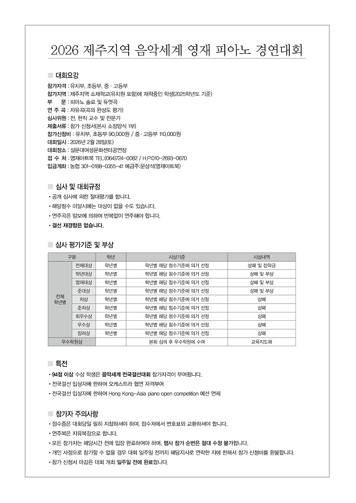2026³â Á¦ÁÖÁö¿ª ¿µÀç ÇÇ¾Æ³ë °æ¿¬´ëȸ